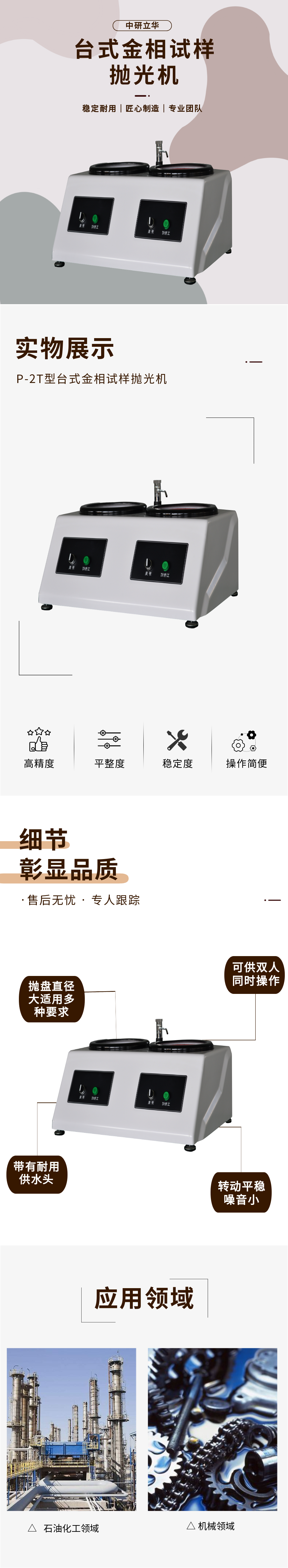 用途:在金相試樣制備過(guò)程中,試樣的拋光是一道主要工序,經(jīng)過(guò)磨光的試樣,在拋光機(jī)上拋光后,可獲得光亮如鏡的表面。該機(jī)可供雙人同時(shí)操作,拋光盤(pán)直徑與傳遞功率均大于國(guó)內(nèi)同類(lèi)產(chǎn)品。