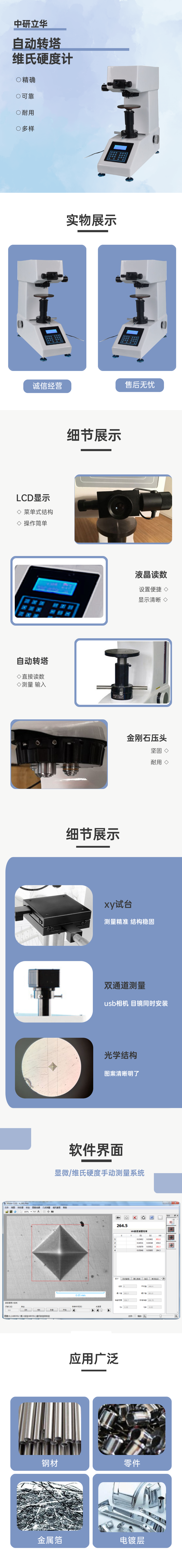 用途:主要用于各種金屬及部分非金屬材料的顯微維氏硬度測定,能夠對各種零件(機加工件、鍛件、鑄鐵、鑄鋼件等)、有色金屬、熱后處理零件等進行硬度的測定。