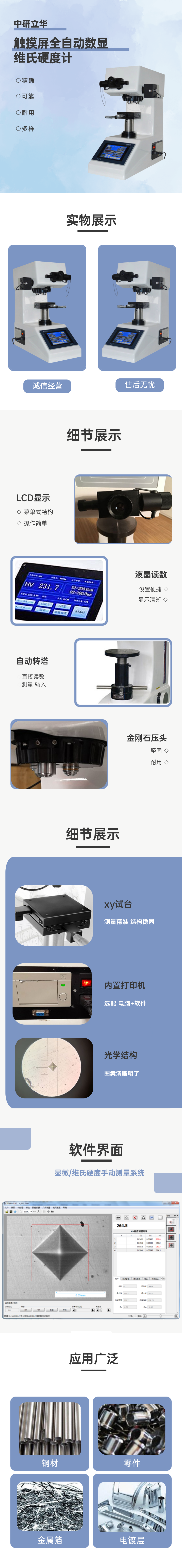 用途:主要用于各種金屬及部分非金屬材料的顯微維氏硬度測定,能夠對各種零件(機加工件、鍛件、鑄鐵、鑄鋼件等)、有色金屬、熱后處理零件等進行硬度的測定。