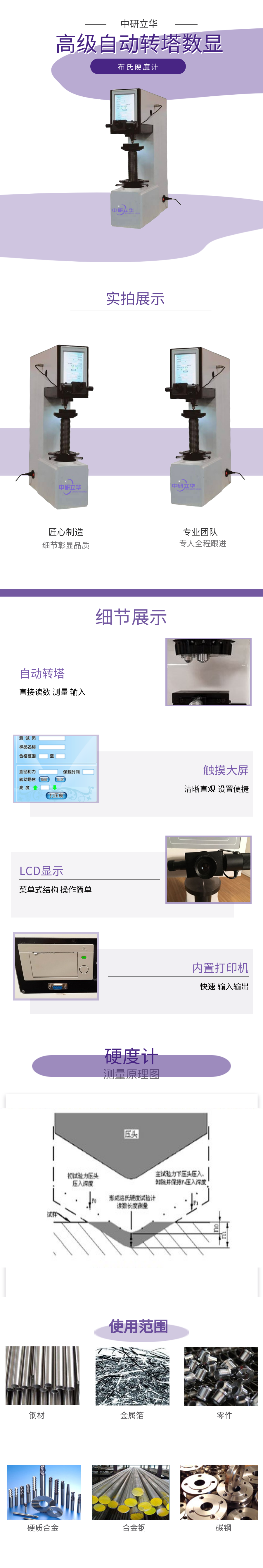 用途:主要用測定黑色金屬、有色金屬、未經淬火鋼及質地較軟材料及軸承合金材料的布氏硬度;應用范圍廣,適合于平行平面的精密測量,測量穩定可靠。