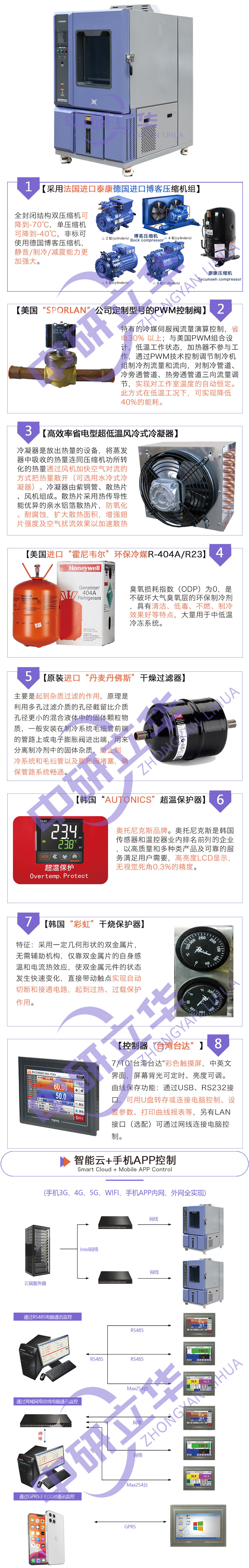 箱體結構形式簡介 整體分為,試驗室、電控柜、機倉三個組合而成:左側上方為試驗室,由保溫層試驗室內膽組成,向左單開門型式出入;電控柜位于右側,面板主要由溫度控制儀、開關按扭、故障保護指示燈組合而成;機倉置于試驗室下方,由過濾器、電磁閥、線路部分、壓縮機等配件組成。