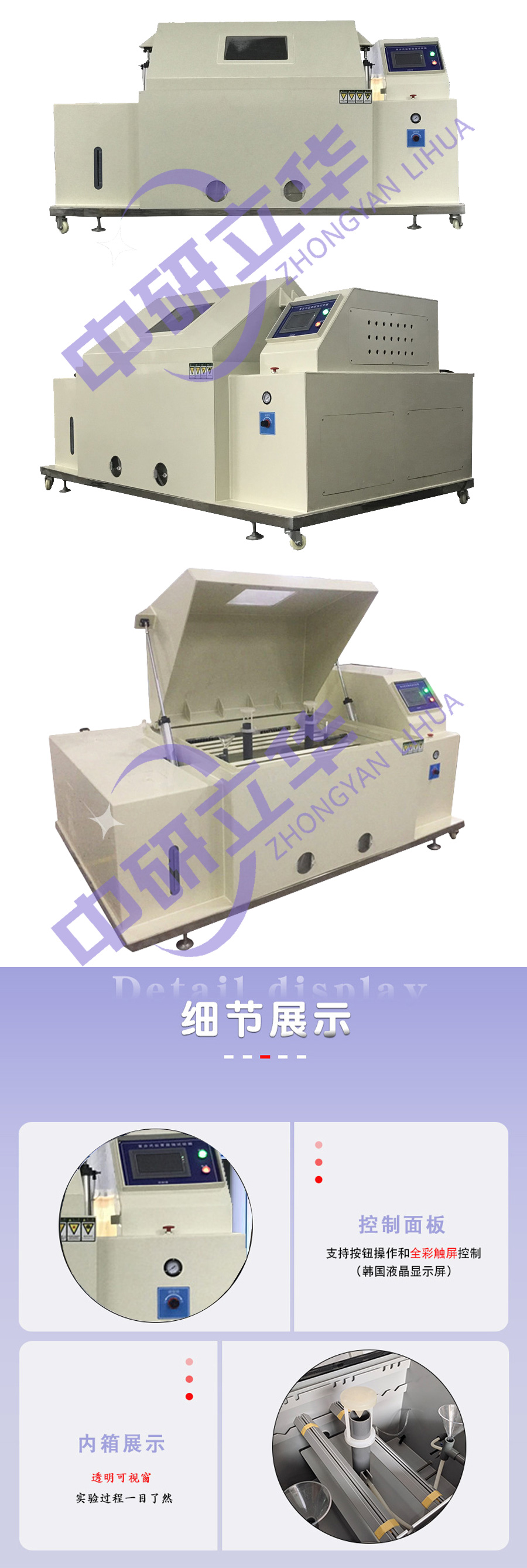 產品用途 溫濕度鹽霧復合試驗機是為加速腐蝕試驗中 接近實際的自然狀況,以自然環境中較常遇見之狀況加以模擬,以數倍於自然 環境之嚴苛條件加以組合測試,如鹽霧、干燥、濕潤、常溫、低溫等環境加以組合,可任意順序或單獨進行測試。主要測試品針對在激烈環境變化下使用的產品, 如汽機車零配件,航空器材、攝影器材、建筑材料、電著涂膜涂料及電子電機系統等金屬電化學腐蝕抗抵性皆適用