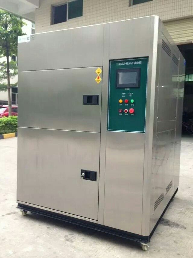 三箱式溫度沖擊試驗箱整體結構,試樣物品完全靜止試驗箱由預熱室、預冷室、工作室、制冷系統、加熱系統、風道系統、電器控制系統組成。工作室位于試驗箱中部,高溫室位于試驗箱下部,低溫室位于試驗箱上部,制冷機系統位于試驗箱的后下部,電器控制柜位于試驗箱右側面上部。